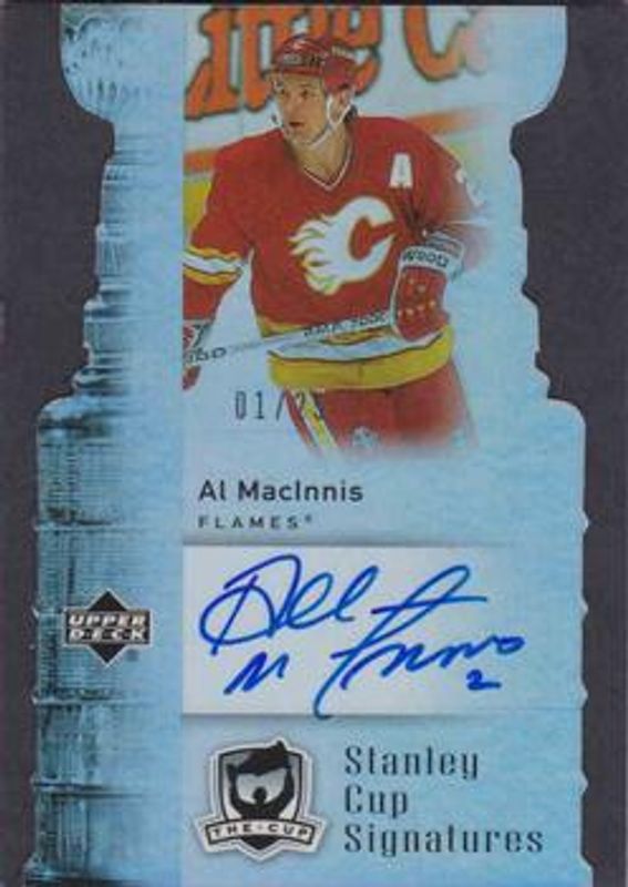 The Al MacInnis 2006 Upper Deck The Cup #CS-AM Stanley Cup Signatures /25 card is 1 of 20 Al MacInnis' card variations in the 2006 Upper Deck The Cup set being tracked by Sports Card Investor, including Base /249, Gold /25, Black Rainbow /1, Printing Plates Black /1, and Printing Plates Cyan /1.