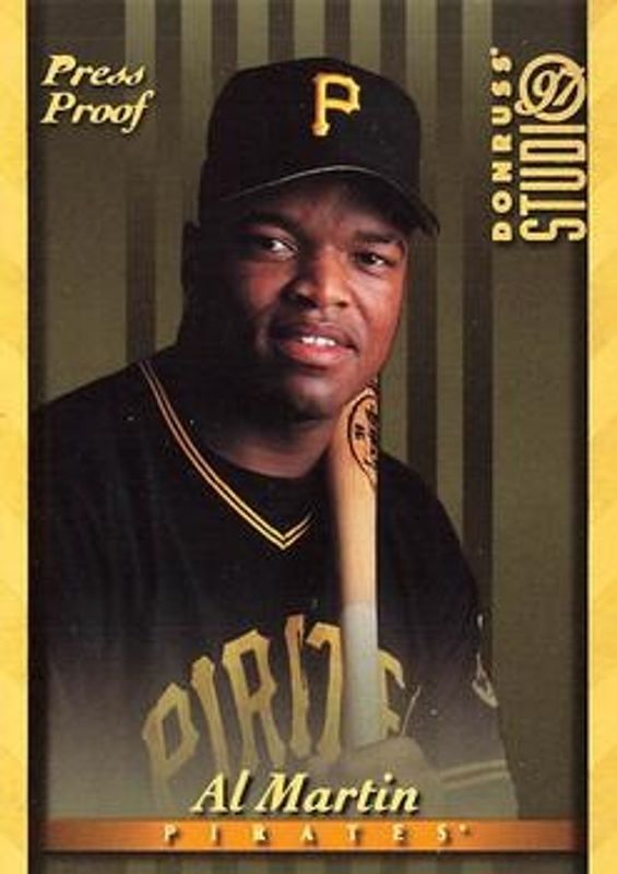 The Al Martin 1997 Donruss Studio #90 Press Proof Gold card is 1 of 3 Al Martin's card variations in the 1997 Donruss Studio set being tracked by Sports Card Investor, including Base, and Press Proof Silver.