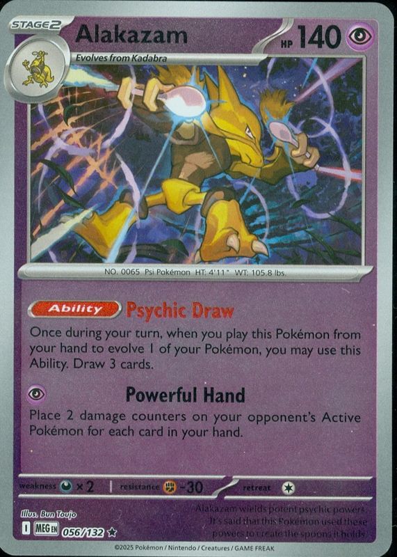 The Alakazam 2025 Mega Evolution #056/132 Reverse Holo card in Raw TCG (Near Mint) condition has moved up $0.33 (+29.7%) in the last 30 days and was last sold for $1.44 .