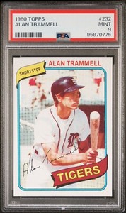 The Alan Trammell 1980 Topps #232 Base card in PSA 9 condition has moved down -$13.27 (-28.5%) in the last 30 days and was last sold for $33.28 .