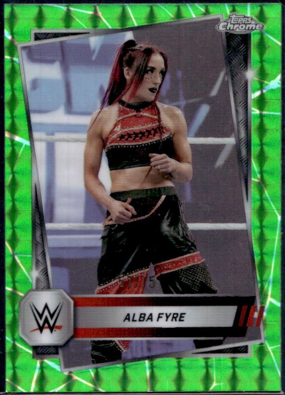 The Alba Fyre 2025 Topps Chrome WWE #88 Neon Green Geometric Refractor /75 card is 1 of 61 Alba Fyre's card variations in the 2025 Topps Chrome WWE set being tracked by Sports Card Investor, including Base, Black & Gold Refractor, Geometric Refractor, Neon Green & Black Refractor, and Pink Shimmer Refractor.