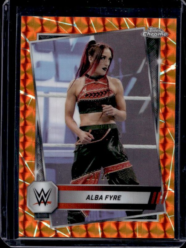 The Alba Fyre 2025 Topps Chrome WWE #88 Orange Geometric Refractor /25 card is 1 of 61 Alba Fyre's card variations in the 2025 Topps Chrome WWE set being tracked by Sports Card Investor, including Base, Black & Gold Refractor, Geometric Refractor, Neon Green & Black Refractor, and Pink Shimmer Refractor.