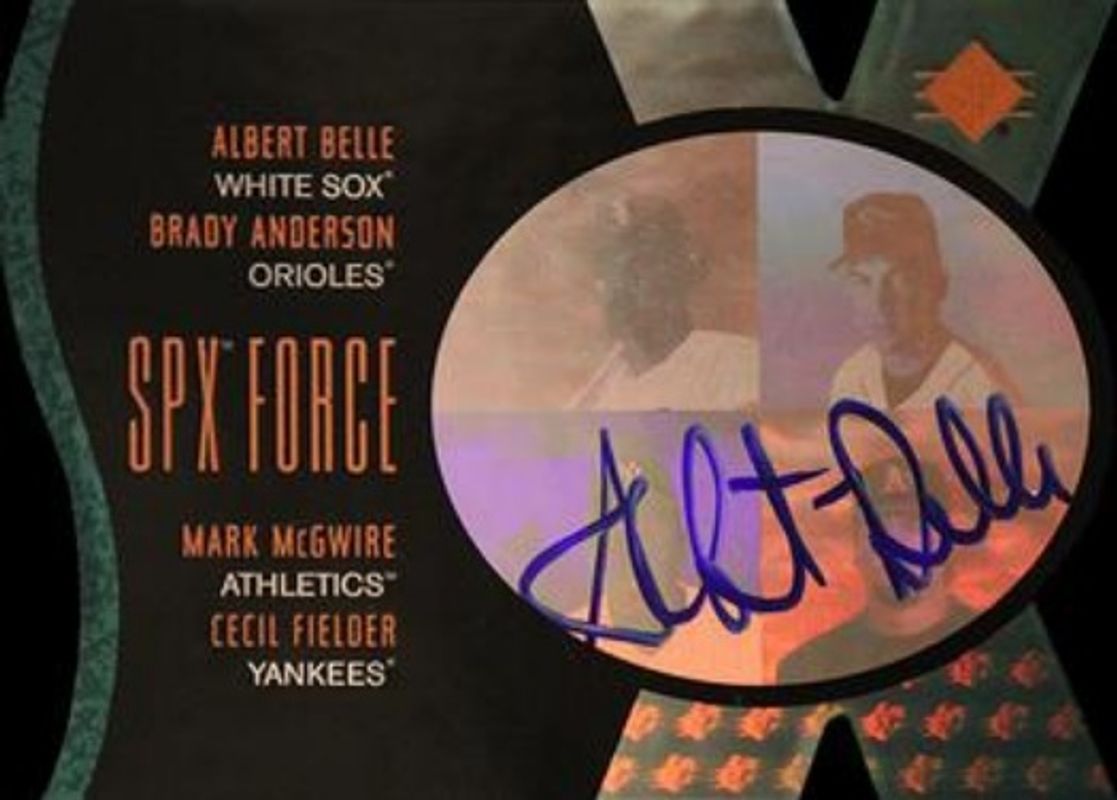 The Albert Belle 1997 SP #2 SPx Force Autographs /100 card is 1 of 4 Albert Belle's card variations in the 1997 SP set being tracked by Sports Card Investor, including Base, Inside Info, and Special FX.
