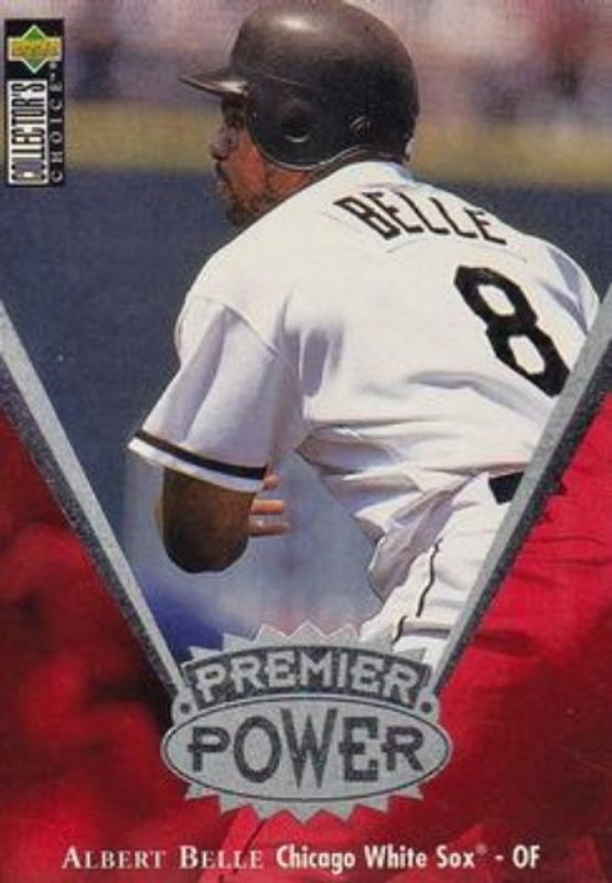 The Albert Belle 1997 Upper Deck Collector's Choice #PP4 Premier Power card is 1 of 19 Albert Belle's card variations in the 1997 Upper Deck Collector's Choice set being tracked by Sports Card Investor, including #329 Base, #76 Base, #7 All Star Connection, #329 Box Toppers, and #2 Memorable Moments.