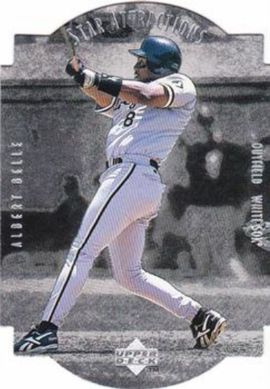 The Albert Belle 1997 Upper Deck #SA9 Star Attractions card is 1 of 13 Albert Belle's card variations in the 1997 Upper Deck set being tracked by Sports Card Investor, including #419 Base, #50 Base, #333 Base, #AG8 Amazing Greats, and #HC12 Hot Commodities.