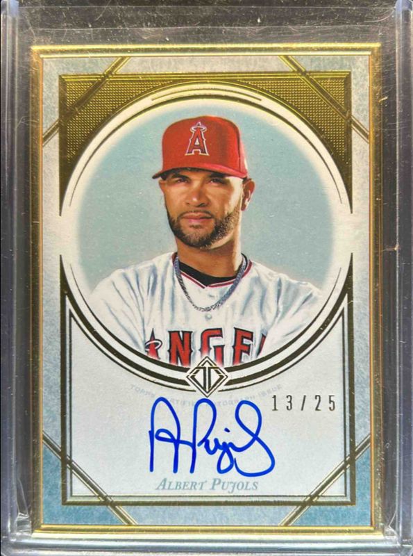 The Albert Pujols 2018 Topps Transcendent #TCA-AP Transcendent Collection Autographs /25 card is 1 of 11 Albert Pujols' card variations in the 2018 Topps Transcendent set being tracked by Sports Card Investor, including Base /83, Origins Sketch Reproductions /83, Transcendent Collection Autographs Emerald /15, Transcendent Collection Autographs Purple /10, and 1952 SuperFractor Autographs /1.