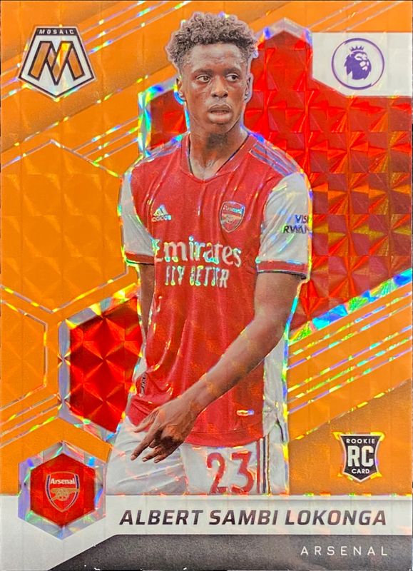 The Albert Sambi Lokonga 2021 Mosaic Premier League #61 Orange Fluorescent Rookie card is 1 of 22 Albert Sambi Lokonga's card variations in the 2021 Mosaic Premier League set being tracked by Sports Card Investor, including Base, Blue Pulsar, Choice Peacock, Choice Red & Green, and Genesis.