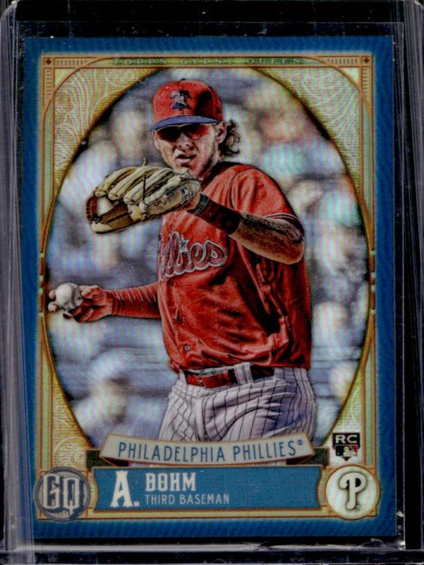 The Alec Bohm 2021 Topps Gypsy Queen #57 Chrome Box Topper - Indigo /150 Rookie card is 1 of 35 Alec Bohm's card variations in the 2021 Topps Gypsy Queen set being tracked by Sports Card Investor, including #57 Base, #57b Base, #57c Base, #GQ-57 Bazooka Back, and #57 Green.