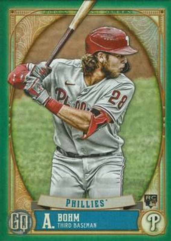 The Alec Bohm 2021 Topps Gypsy Queen #57 Green Rookie card is 1 of 35 Alec Bohm's card variations in the 2021 Topps Gypsy Queen set being tracked by Sports Card Investor, including #57 Base, #57b Base, #57c Base, #GQ-57 Bazooka Back, and #57 Missing Nameplate.