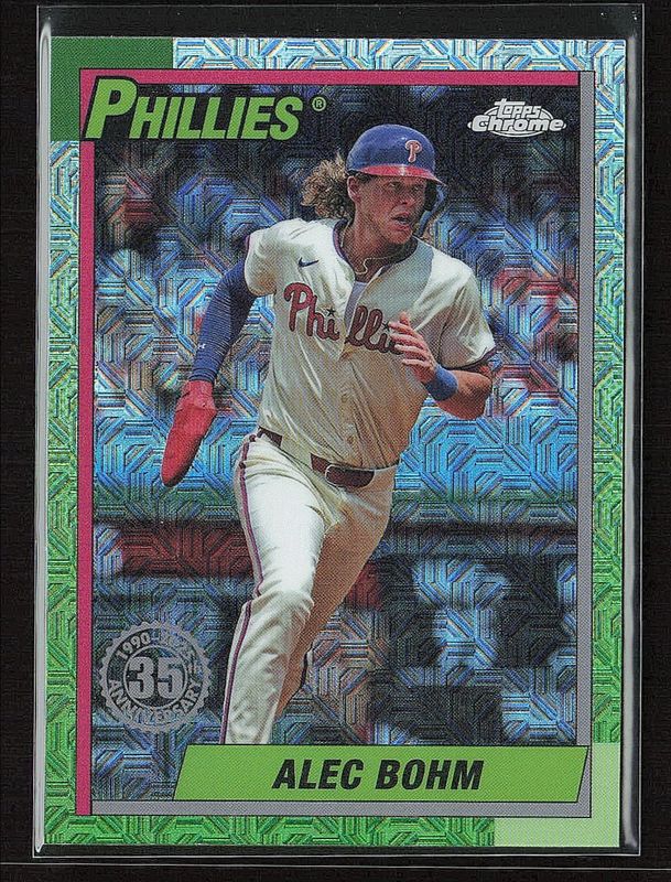 The Alec Bohm 2025 Topps #T90C-131 1990 Baseball Chrome Silver Pack card is 1 of 110 Alec Bohm's card variations in the 2025 Topps set being tracked by Sports Card Investor, including Base, Aqua Holo Foil, Diamante Foil, Holo Foil, and Pink Diamante Foil.
