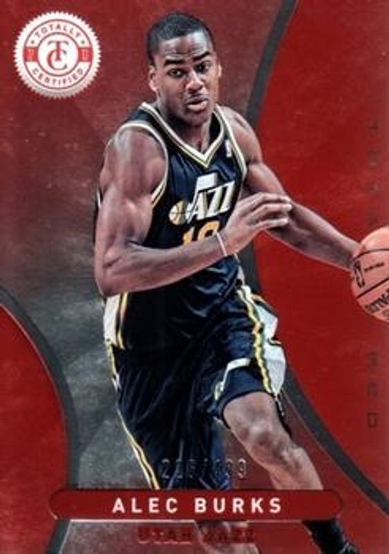 The Alec Burks 2012 Totally Certified #225 Totally Red /499 Rookie card is 1 of 16 Alec Burks' card variations in the 2012 Totally Certified set being tracked by Sports Card Investor, including Base, Totally Blue /299, Totally Gold /25, Totally Green /5, and Printing Plate Black /1.