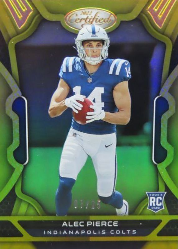 The Alec Pierce 2022 Certified #136 Mirror Gold /25 Rookie card in Raw condition has not changed in price in the last 30 days and was last sold for $11.50 .