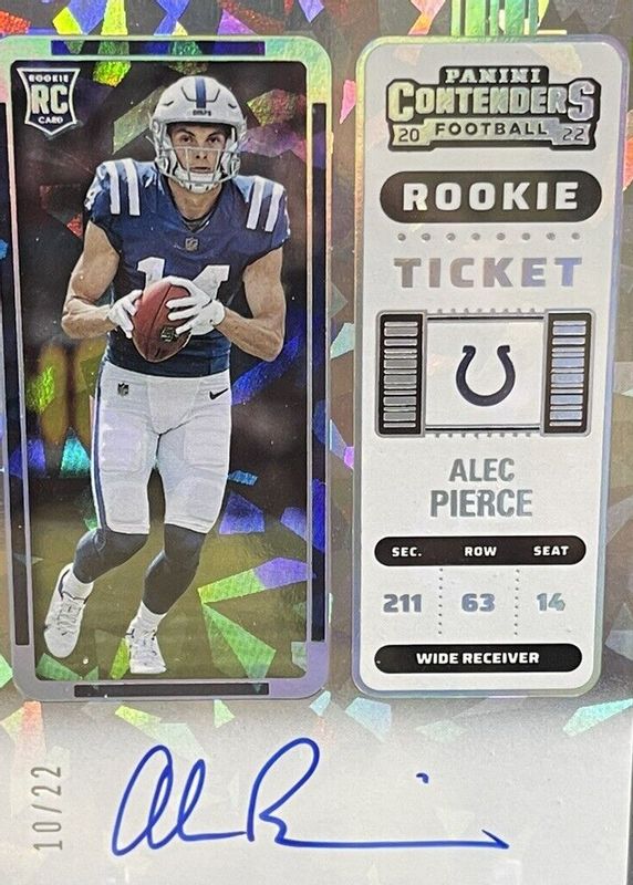 This card is 1 of 31 Alec Pierce's card variations in the 2022 Contenders set being tracked by Sports Card Investor, including Rookie Ticket Auto, Rookie Ticket Auto - Red Zone Ticket, Rookie Ticket Auto - Silver (/99), Rookie Ticket Auto - Ticket Stub (/14), and Rookie Ticket Auto - Wild Card.