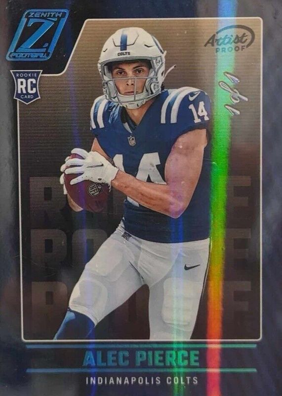 This card is 1 of 20 Alec Pierce's card variations in the 2022 Zenith set being tracked by Sports Card Investor, including Base, No Huddle, Red Zone, Retail, and 1st Down /100.