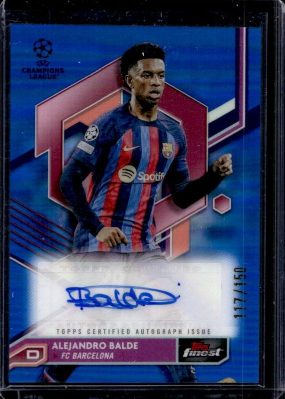 The Alejandro Balde 2022 Topps Finest UEFA Club Competitions #A-BA Autographs - Blue Refractor /150 card is 1 of 10 Alejandro Balde's card variations in the 2022 Topps Finest UEFA Club Competitions set being tracked by Sports Card Investor, including Autographs, Autographs - Neon Green Refractor /99, Autographs - Neon Green Wave Refractor /99, Autographs - Gold Refractor /50, and Autographs - Orange Refractor /25.