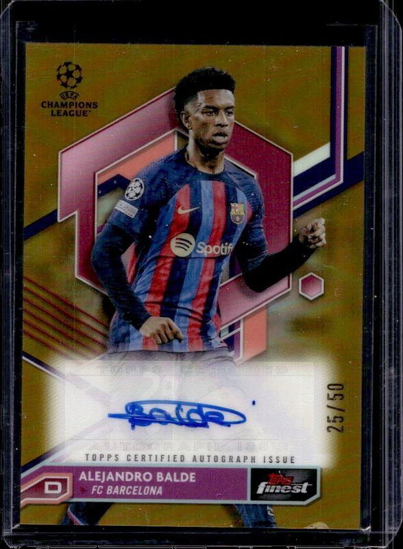 The Alejandro Balde 2022 Topps Finest UEFA Club Competitions #A-BA Autographs - Gold Refractor /50 card is 1 of 10 Alejandro Balde's card variations in the 2022 Topps Finest UEFA Club Competitions set being tracked by Sports Card Investor, including Autographs, Autographs - Blue Refractor /150, Autographs - Neon Green Refractor /99, Autographs - Neon Green Wave Refractor /99, and Autographs - Orange Refractor /25.