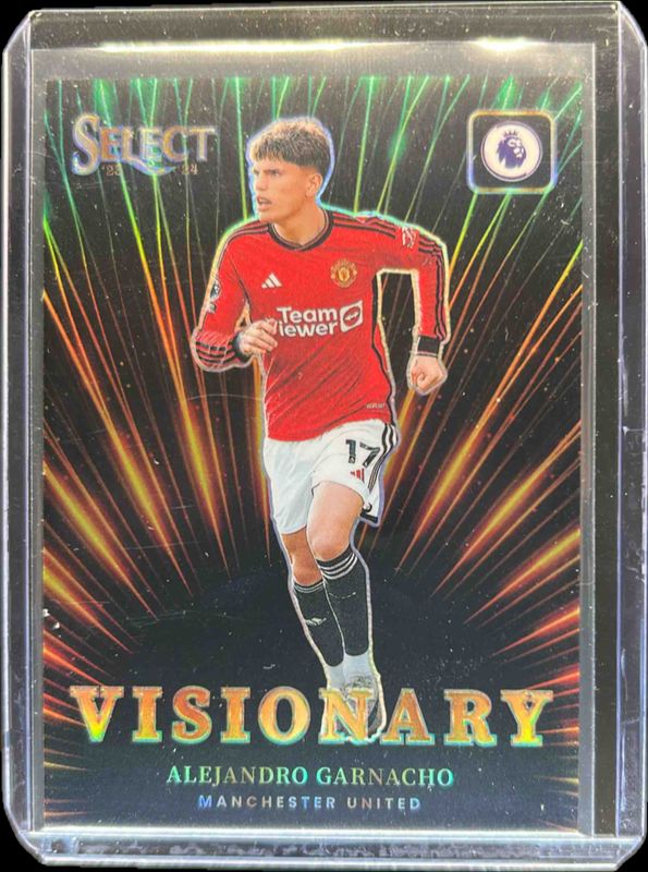 The Alejandro Garnacho 2023 Select Premier League #9 Visionary card is 1 of 46 Alejandro Garnacho's card variations in the 2023 Select Premier League set being tracked by Sports Card Investor, including Base, Blue, Checkerboard, Green Ice, and Multi Color.