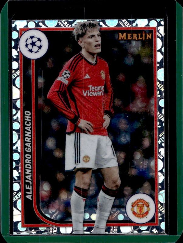 The Alejandro Garnacho 2023 Topps Merlin Chrome UEFA Club Competitions #82 Vintage Merlin Refractor card is 1 of 31 Alejandro Garnacho's card variations in the 2023 Topps Merlin Chrome UEFA Club Competitions set being tracked by Sports Card Investor, including Base, Aqua Prism Refractor, Refractor, Neon Green Shimmer Refractor /399, and Rose Gold Shimmer Refractor /299.