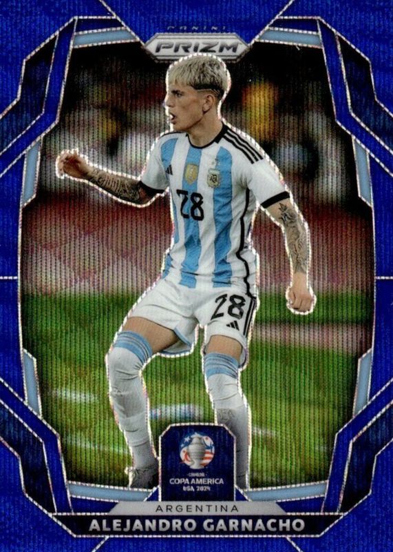The Alejandro Garnacho 2024 Prizm Copa America #15 Blue Wave /199 card in Raw condition has not changed in price in the last 30 days and was last sold for $8.00 .