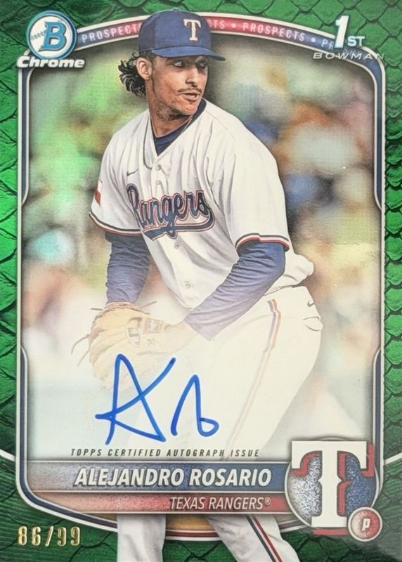The Alejandro Rosario 2025 Bowman Chrome #CPA-ARO Prospect Auto - Reptilian Green Refractor /99 (1st) card in Raw condition has moved up $3.00 (+17.1%) in the last 30 days and was last sold for $20.50 .