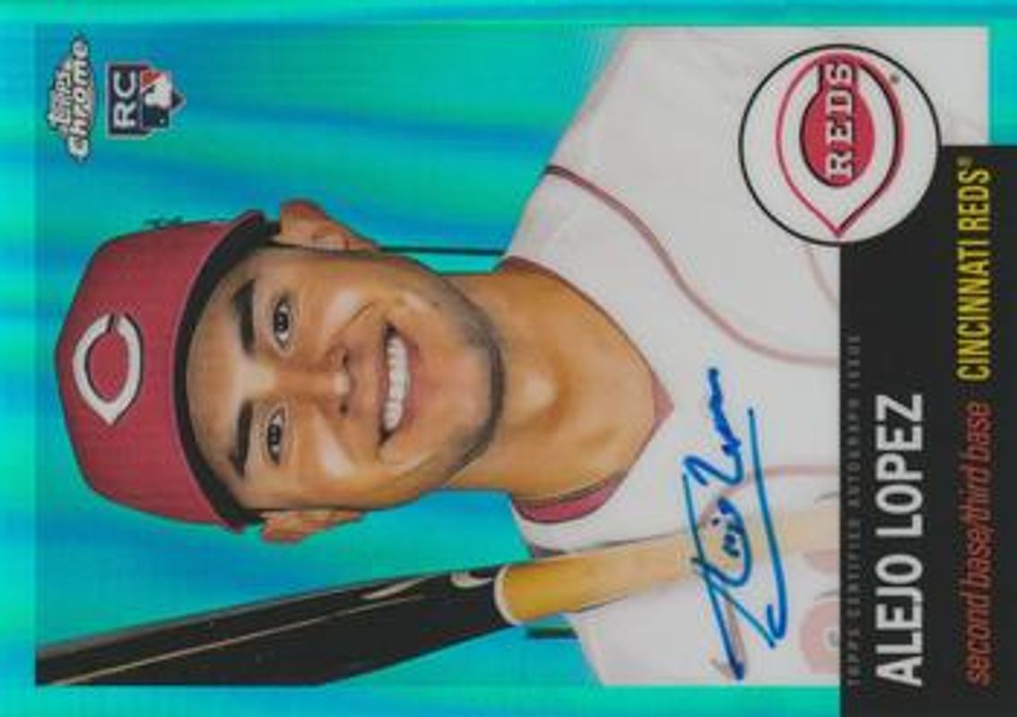 The Alejo Lopez 2022 Topps Chrome Platinum Anniversary #CPA-AL Autographs - Aqua Refractor /150 Rookie card is 1 of 11 Alejo Lopez's card variations in the 2022 Topps Chrome Platinum Anniversary set being tracked by Sports Card Investor, including Autographs, Autographs - Refractor /199, Autographs - Blue Prism Refractor /99, Autographs - Platinum Toile Cream Blue Refractor /99, and Autographs - Gold Refractor /50.