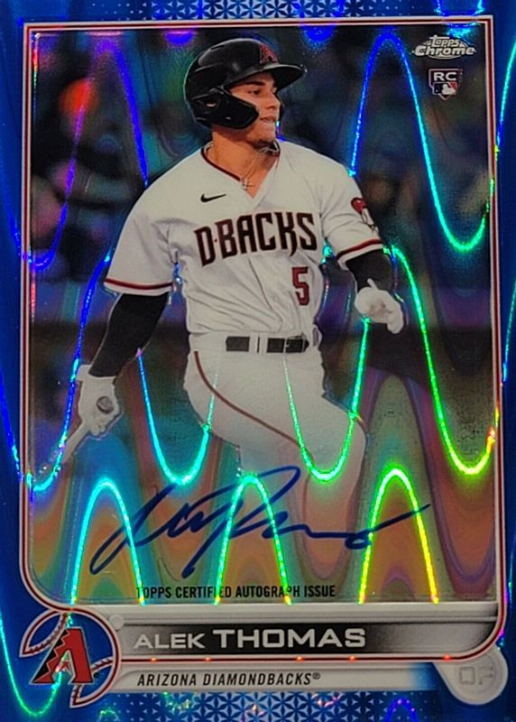 This card is 1 of 15 Alek Thomas' card variations in the 2022 Topps Chrome set being tracked by Sports Card Investor, including Rookie Auto, Rookie Auto - Refractor /499, Rookie Auto - Purple Speckle Refractor /299, Rookie Auto - Purple Refractor /250, and Rookie Auto - Aqua Wave Refractor /199.