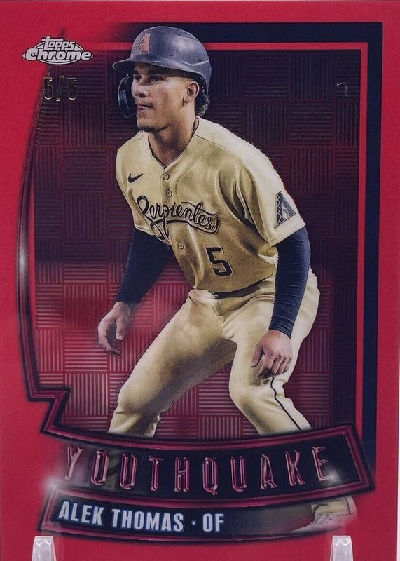 The Alek Thomas 2023 Topps Chrome #YQ-9 Youthquake - Red Refractor /5 card in Raw condition has not changed in price in the last 30 days and was last sold for $30.00 .