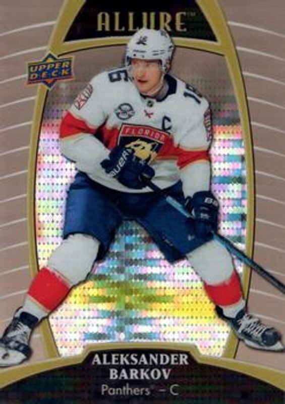 The Aleksander Barkov 2019 Upper Deck Allure #7 Pewter card is 1 of 27 Aleksander Barkov's card variations in the 2019 Upper Deck Allure set being tracked by Sports Card Investor, including Base, Red Rainbow, White Rainbow, Yellow Taxi, and Orange Slice /199.