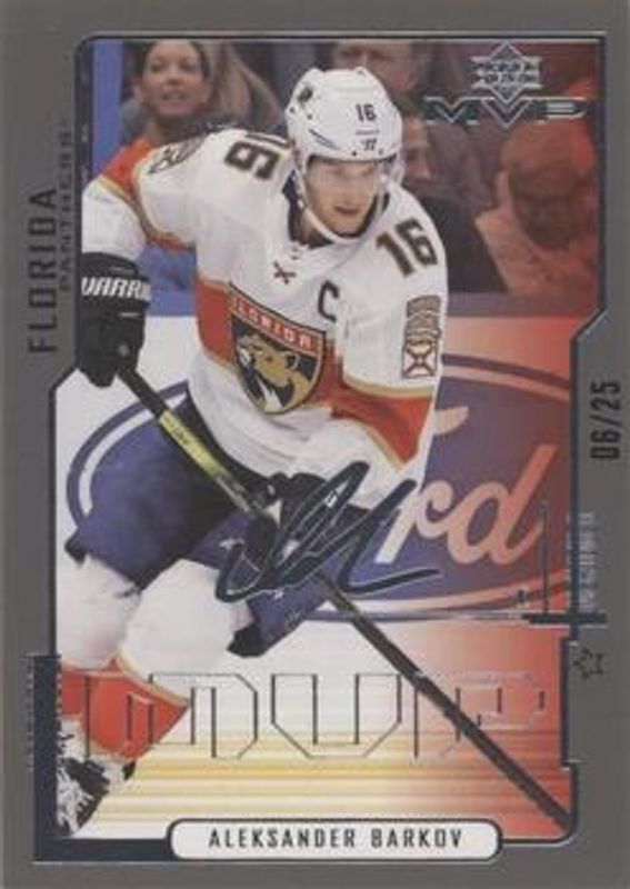 The Aleksander Barkov 2020 Upper Deck MVP #95 20th Anniversary First Star /25 card is 1 of 22 Aleksander Barkov's card variations in the 2020 Upper Deck MVP set being tracked by Sports Card Investor, including Base, Blue, Gold Script, Puzzle Backs, and Silver Script.