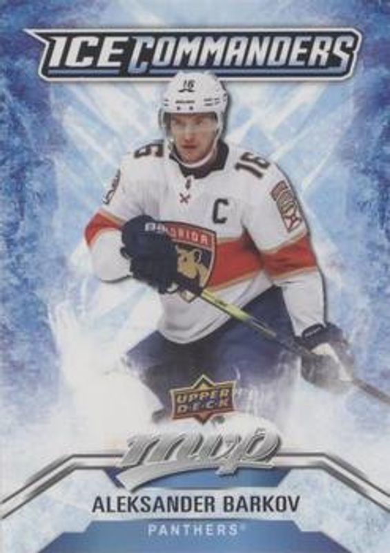 The Aleksander Barkov 2020 Upper Deck MVP #IC-9 Ice Commanders card is 1 of 22 Aleksander Barkov's card variations in the 2020 Upper Deck MVP set being tracked by Sports Card Investor, including Base, Blue, Gold Script, Puzzle Backs, and Silver Script.