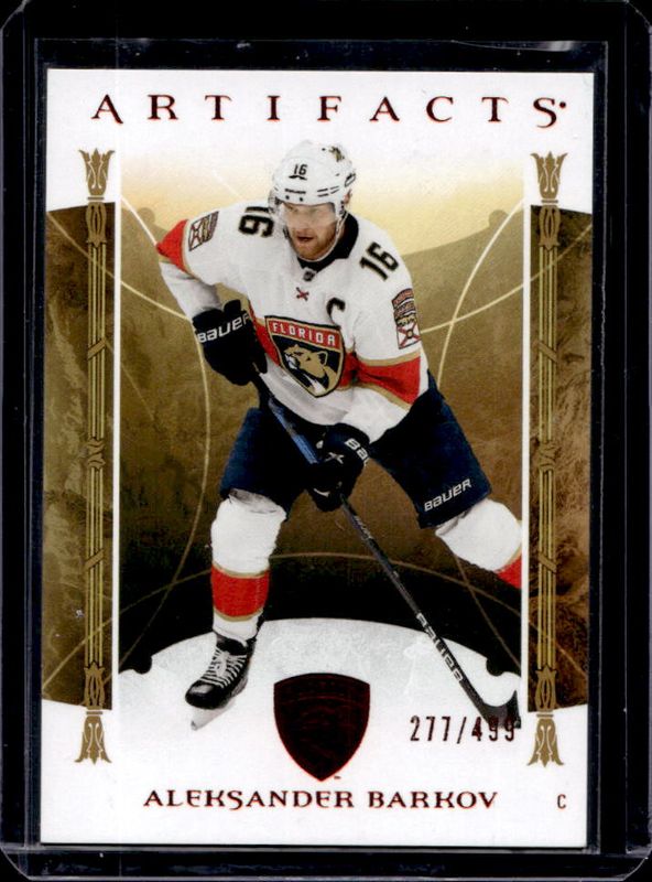 The Aleksander Barkov 2022 Upper Deck Artifacts #120 Ruby /499 card is 1 of 35 Aleksander Barkov's card variations in the 2022 Upper Deck Artifacts set being tracked by Sports Card Investor, including Base /999, Leather, Plexi, Turquoise, and Wood.