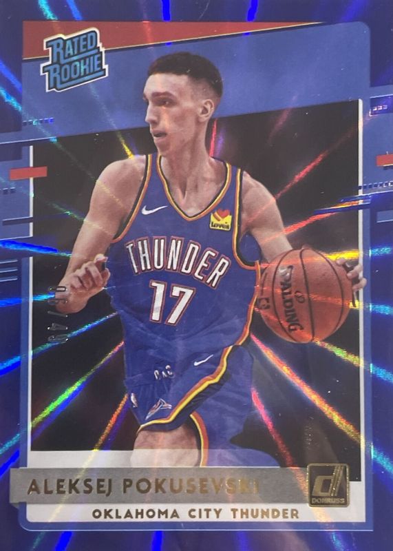 The Aleksej Pokusevski 2020 Donruss #209 Blue Laser /49 Rookie card in Raw condition has not changed in price in the last 30 days and was last sold for $24.99 .