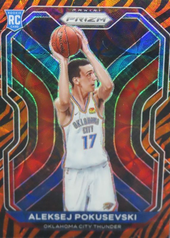 The Aleksej Pokusevski 2020 Prizm #264 Choice Tiger Stripe /(SSP) Rookie card in Raw condition has not changed in price in the last 30 days and was last sold for $65.00 .