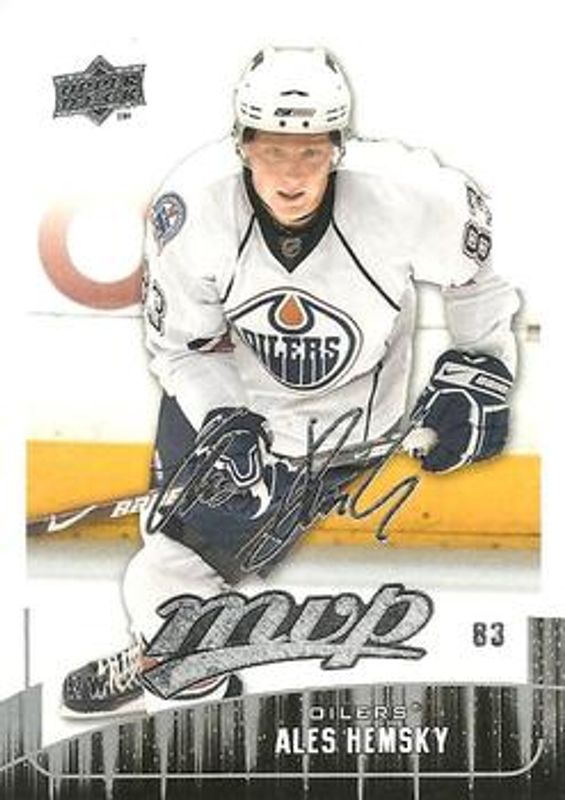 The Ales Hemsky 2009 Upper Deck MVP #179 Base card is 1 of 3 Ales Hemsky's card variations in the 2009 Upper Deck MVP set being tracked by Sports Card Investor, including Gold Script /100, and Super Script /25.