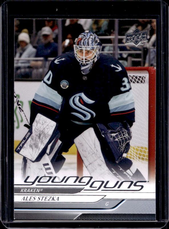 The Ales Stezka 2024 Upper Deck Extended Series #725 Base Rookie card is 1 of 27 Ales Stezka's card variations in the 2024 Upper Deck Extended Series set being tracked by Sports Card Investor, including Young Guns Base, Clear Cut, Outburst, Young Guns - Clear Cut, and Young Guns - Outburst Silver.