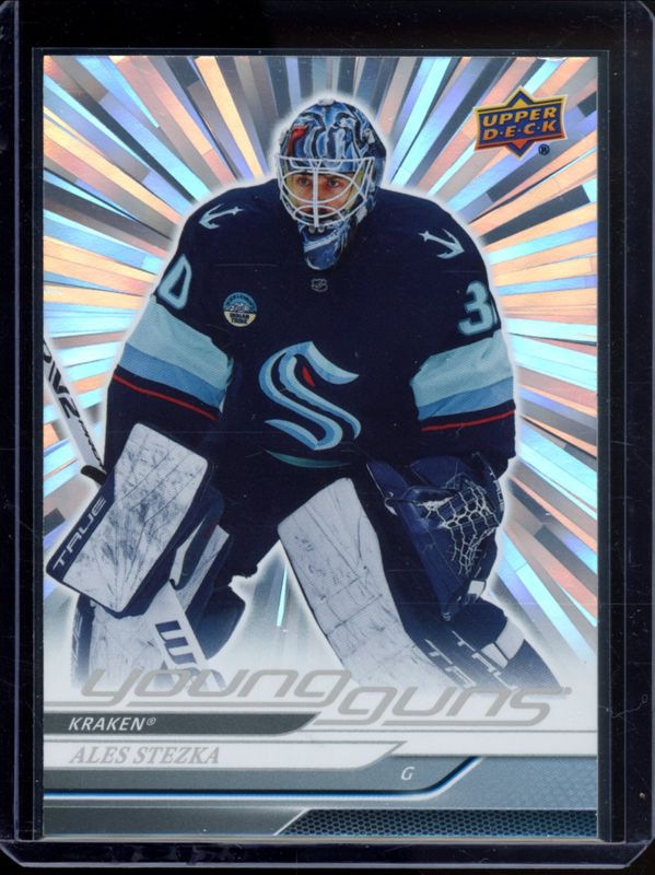The Ales Stezka 2024 Upper Deck Extended Series #725 Outburst Rookie card is 1 of 27 Ales Stezka's card variations in the 2024 Upper Deck Extended Series set being tracked by Sports Card Investor, including Base, Young Guns Base, Clear Cut, Young Guns - Clear Cut, and Young Guns - Outburst Silver.