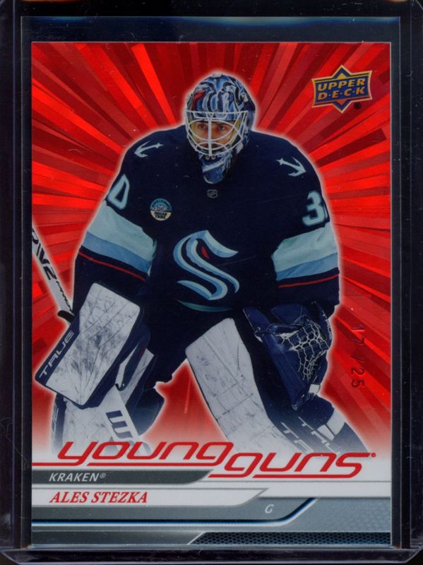 The Ales Stezka 2024 Upper Deck Extended Series #725 Outburst Red /25 Rookie card is 1 of 27 Ales Stezka's card variations in the 2024 Upper Deck Extended Series set being tracked by Sports Card Investor, including Base, Young Guns Base, Clear Cut, Outburst, and Young Guns - Clear Cut.