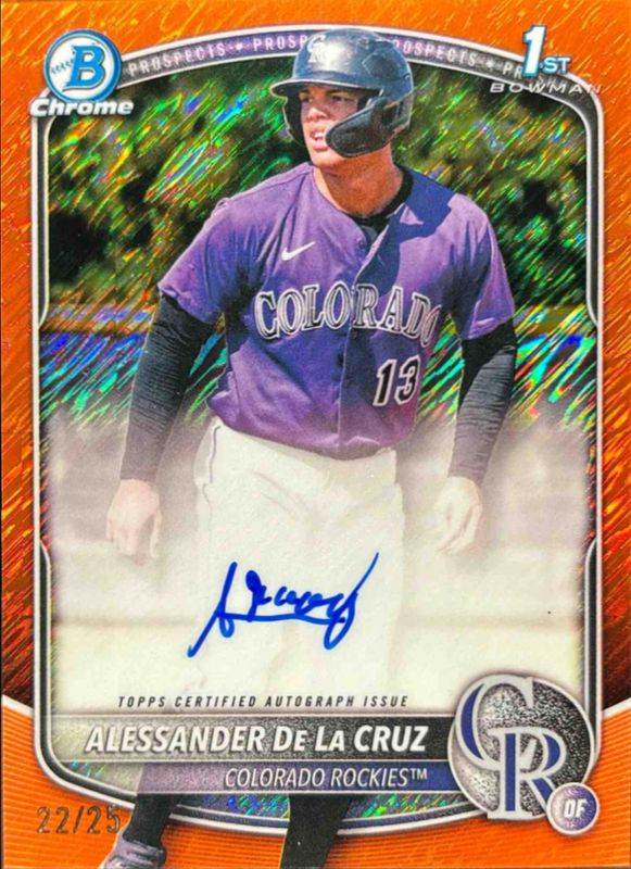Best Prices Available For Sale of Alessander De La Cruz 2025 Bowman Chrome #CPA-AD Prospect Auto - Orange Shimmer Refractor /25 (1st)