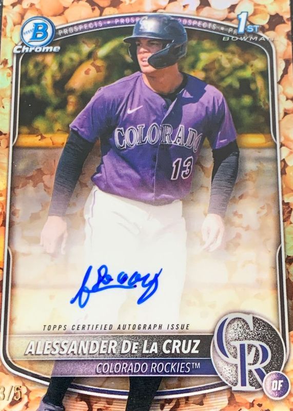 Best Prices Available For Sale of Alessander De La Cruz 2025 Bowman Chrome #CPA-AD Prospect Auto - Popcorn Refractor /5 (1st)