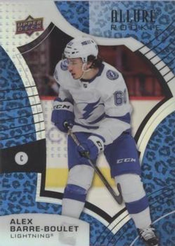 The Alex Barre-Boulet 2021 Upper Deck Allure #123 Pink Blue Leopard Rookie card is 1 of 39 Alex Barre-Boulet's card variations in the 2021 Upper Deck Allure set being tracked by Sports Card Investor, including Base, 1917 Shield, 2005 Shield, Black Rainbow, and Blue China.