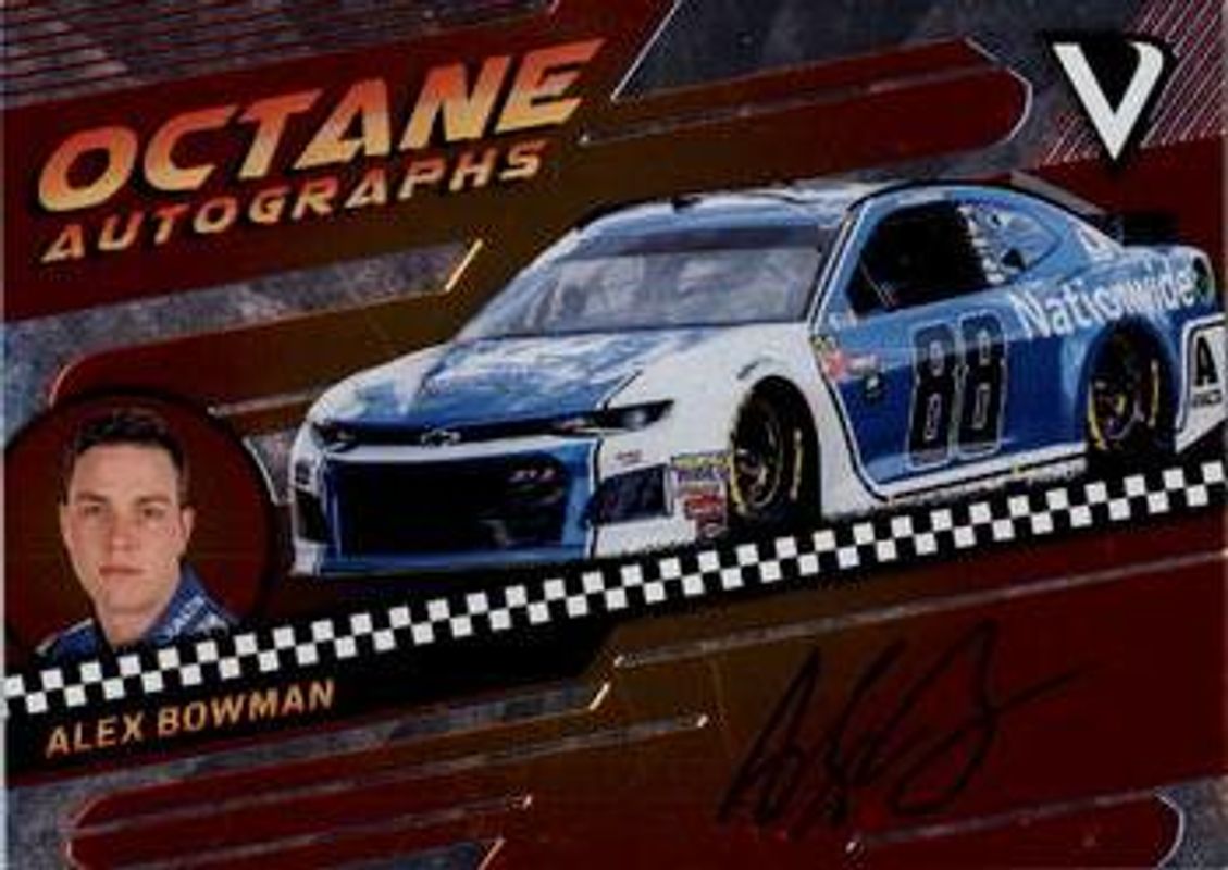 The Alex Bowman 2018 Victory Lane NASCAR #OA-AB Octane Autographs /125 card is 1 of 42 Alex Bowman's card variations in the 2018 Victory Lane NASCAR set being tracked by Sports Card Investor, including Base, Silver, Gold /99, Red /49, and Blue /25.