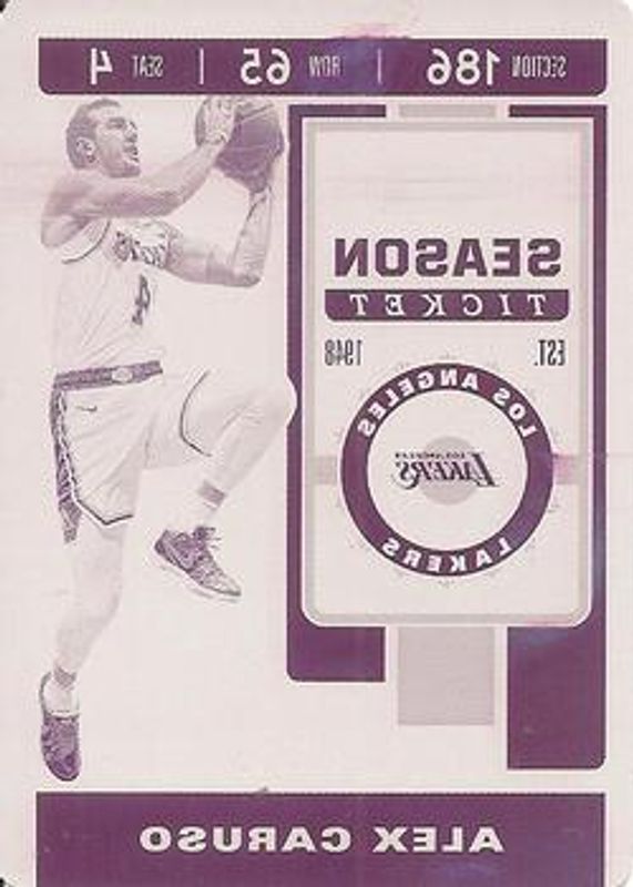 Alex Caruso's Basketball cards are available in at least 64 sets. Alex Caruso's biggest 7-day price movers are 2017 Essentials #DG-ACR Destined for Greatness /99, 2019 Contenders Optic #86 Printing Plates Magenta /1, and 2019 Contenders Optic #86 Base.
