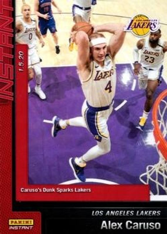 The Alex Caruso 2019 Panini Instant #61 Base card is 1 of 10 Alex Caruso's card variations in the 2019 Panini Instant set being tracked by Sports Card Investor, including #235 Base, #61 Yellow /88, #61 Orange /25, #61 Green /10, and #235 Green /10.