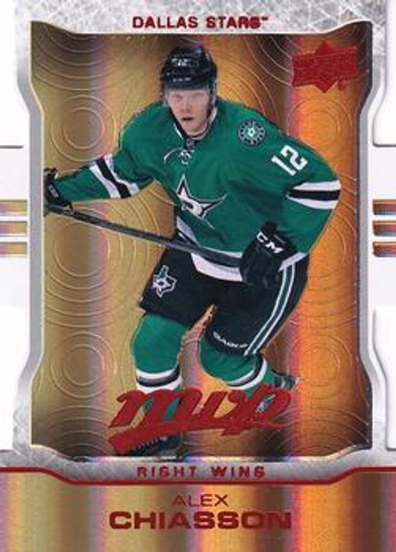 The Alex Chiasson 2014 Upper Deck MVP #61 Colors & Contours card is 1 of 9 Alex Chiasson's card variations in the 2014 Upper Deck MVP set being tracked by Sports Card Investor, including Base, Silver Script, Gold Script /100, Super Script /25, and Printing Plates Black /1.