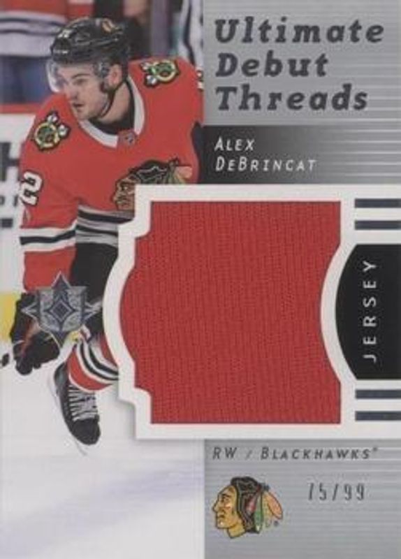 The Alex DeBrincat 2017 Upper Deck Ultimate Collection #RDT-AD 2007 Retro Debut Threads /99 Rookie card is 1 of 22 Alex DeBrincat's card variations in the 2017 Upper Deck Ultimate Collection set being tracked by Sports Card Investor, including Base /99, Auto Patch /10, Shield Patch /1, Future Legacy Jersey, and Future Legacy Signatures.