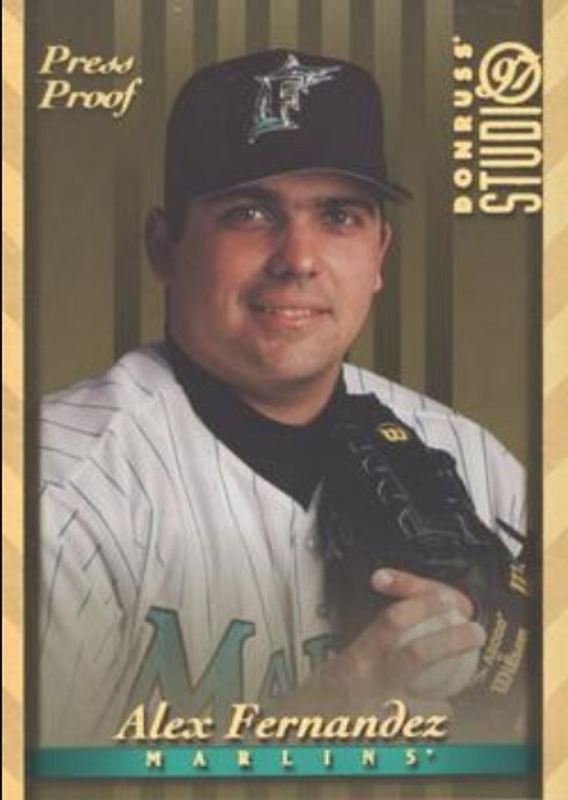 The Alex Fernandez 1997 Donruss Studio #52 Press Proof Gold card is 1 of 3 Alex Fernandez's card variations in the 1997 Donruss Studio set being tracked by Sports Card Investor, including Base, and Press Proof Silver.
