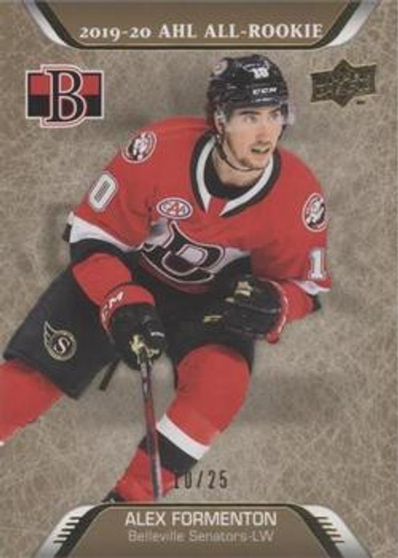 The Alex Formenton 2020 Upper Deck AHL #203 Gold /25 card is 1 of 13 Alex Formenton's card variations in the 2020 Upper Deck AHL set being tracked by Sports Card Investor, including #102 Base, #203 Base, #203 Red, #102 UD Exclusives /100, and #102 UD High Gloss /10.