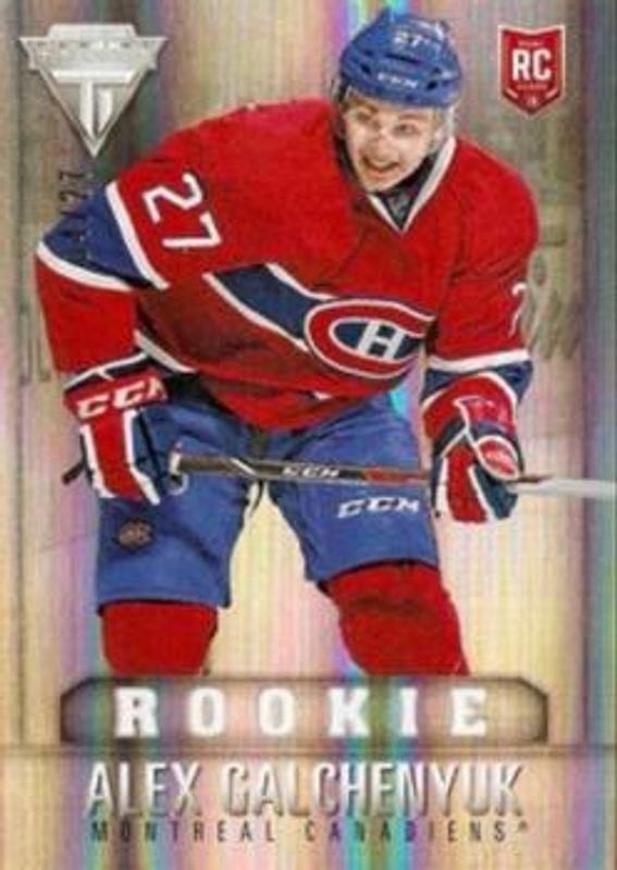 The Alex Galchenyuk 2013 Titanium #192 Base /91 Rookie card is 1 of 20 Alex Galchenyuk's card variations in the 2013 Titanium set being tracked by Sports Card Investor, including Commons Retail /299, Commons Retail Red /99, Hobby Draft Position /20, Commons Retail Gold /10, and Printing Plates Black /1.