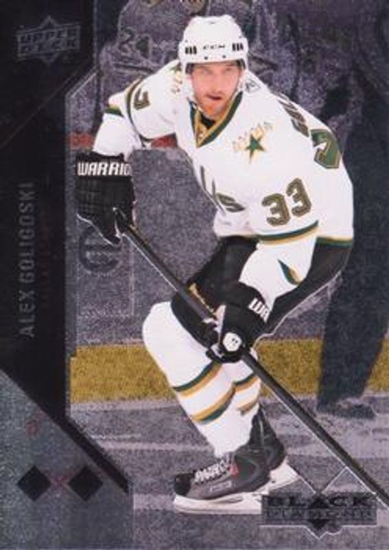 The Alex Goligoski 2011 Upper Deck Black Diamond #118 Base card is 1 of 4 Alex Goligoski's card variations in the 2011 Upper Deck Black Diamond set being tracked by Sports Card Investor, including Ruby /100, Gold /10, and Platinum /1.