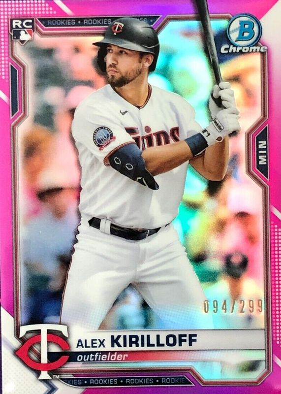 The Alex Kirilloff 2021 Bowman Chrome #3 Pink Refractor /299 Rookie card in Raw condition has not changed in price in the last 30 days and was last sold for $1.75 .